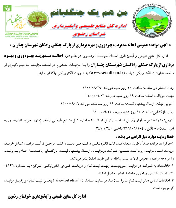آگهی مزایده عمومی احاله مدیریت ، بهره وری و بهره برداری از پارک جنگلی رادکان شهرستان چناران