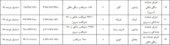 اداره کل منابع طبیعی وآبخیزداری استان خراسان رضوی در نظر دارد برابر اعتبار ابلاغی (صندوق توسعه ملی 98 ) به منظور اجرای عملیات آبخیزداری مطابق مشخصات فنی ارائه شده در پیوست های اسناد مناقصه و با رعایت کلیه موارد اعلامی در چارچوب قانون برگزاری مناقصات مصوب1383 و آیین نامهها و اصلاحیههای بعدی و با شرایط ذیل از طریق مناقصه به شرکت های واجد صلاحیت از سازمان برنامه و بودجه کشور در رشته های « آب » ، « ساختمان و ابنیه » ، حداقل رتبه 5 ، با اولویت بومی استان خراسان رضوی و دارای حداقل سه مورد اجرای پروژه آبخیزداری واگذار نماید . لذا از آن شرکت های محترم دعوت بعمل می آید با توجه به شرایط اعلام شده ذیل از طریق سامانه تدارکات الکترونیک دولت (ستاد) به نشانی http:/setadiran.ir در مهلت مقررنسبت به ارائه پیشنهاد قیمت اقدام نمایند.